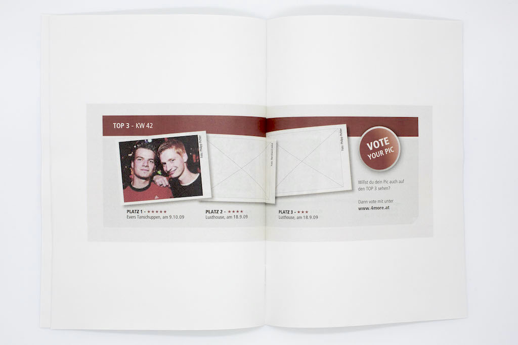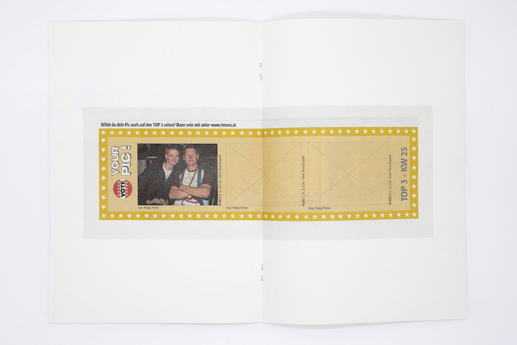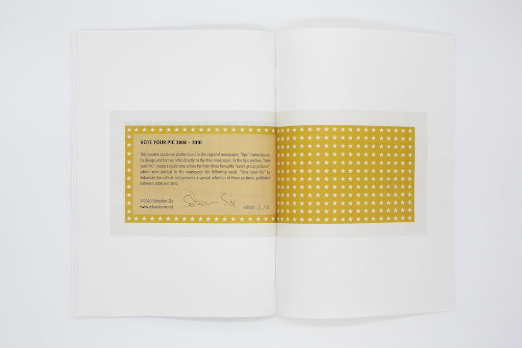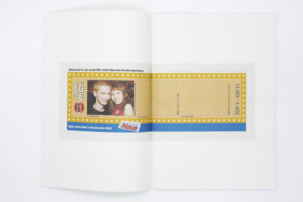 This booklet combines photos from the regional newspaper „tips“ (www.tips.at). The design and format relate directly to the free newspaper. In the „vote your pic“ section, readers could vote online for their three favorite „event group pictures,“ which were printed in the newspaper the following week. The piece presents a special collection of these images, published between 2008 and 2010.