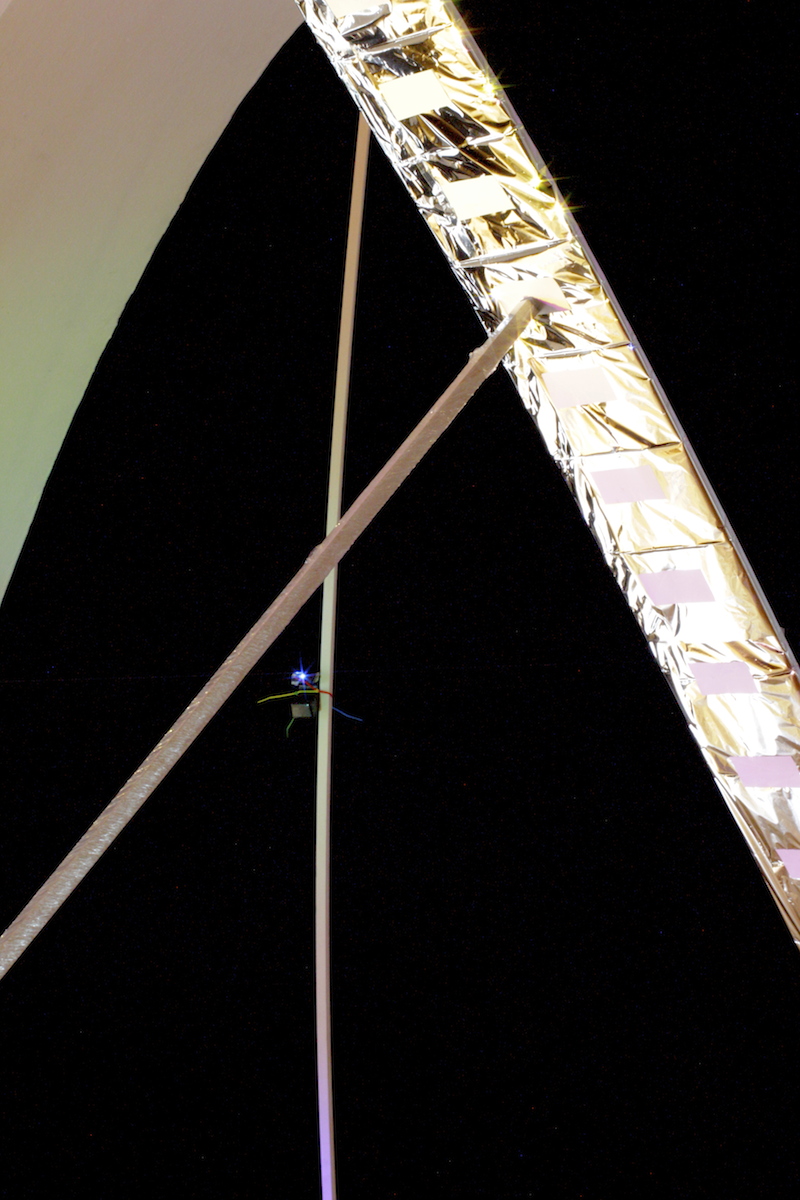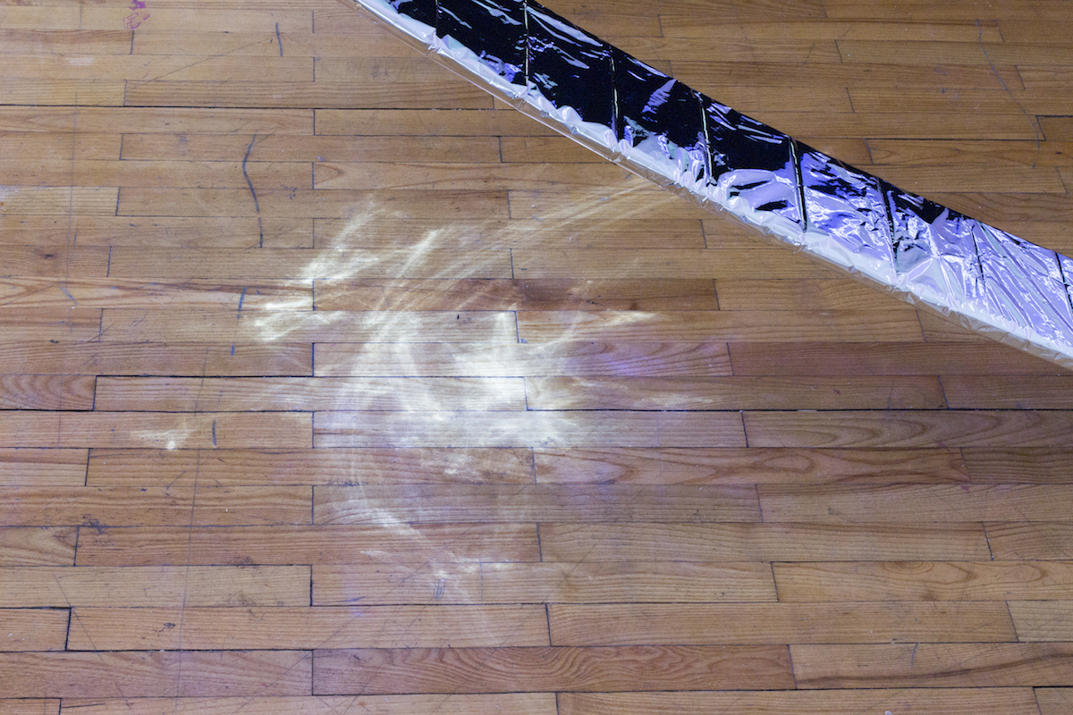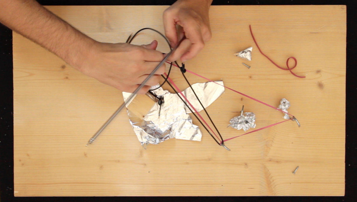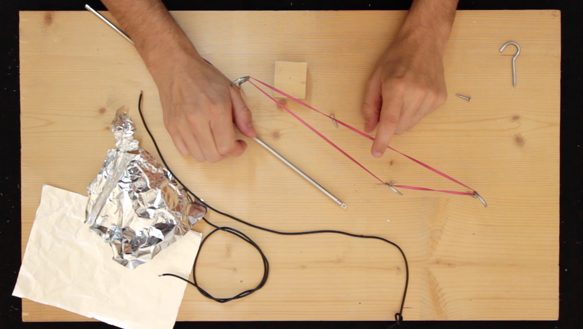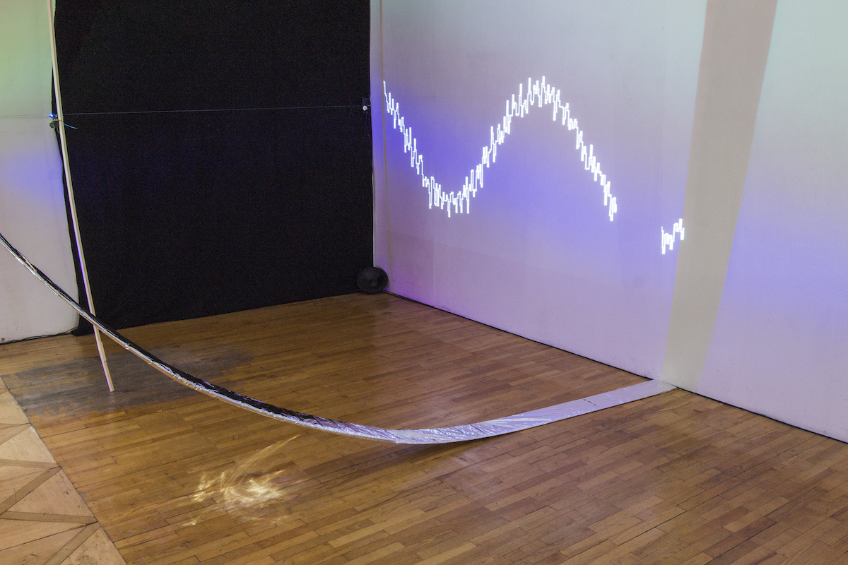 surfing on a long wire ist eine Klanginstallation und ein performatives Instrument zugleich. Ein großer, glänzender Graph füllt den Raum und nimmt durch Licht, Schatten und Reflexionen die Formen des Raumes auf, um mit ihnen zu spielen. Eine lange Saite wird von einer Ecke des Raumes bis zur Säule gespannt, die den Graphen an der Decke.