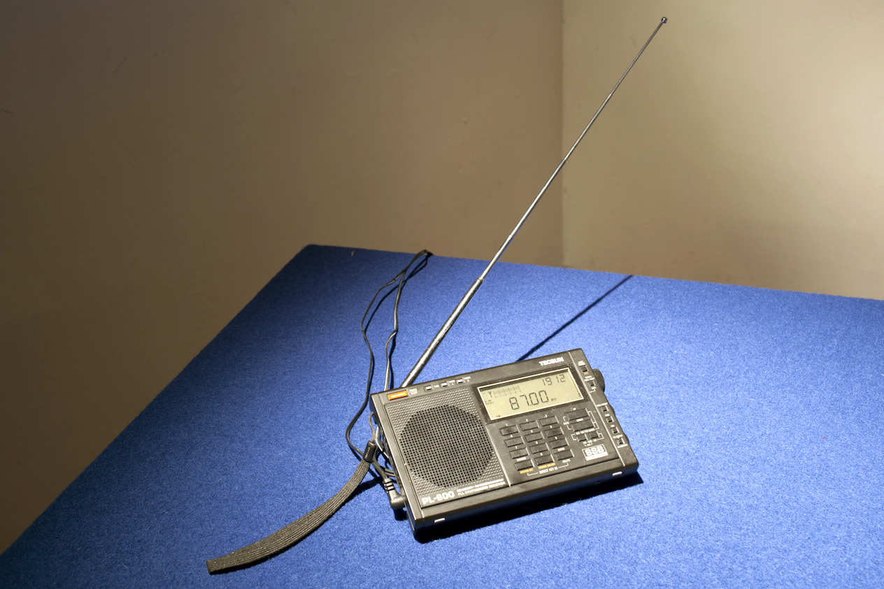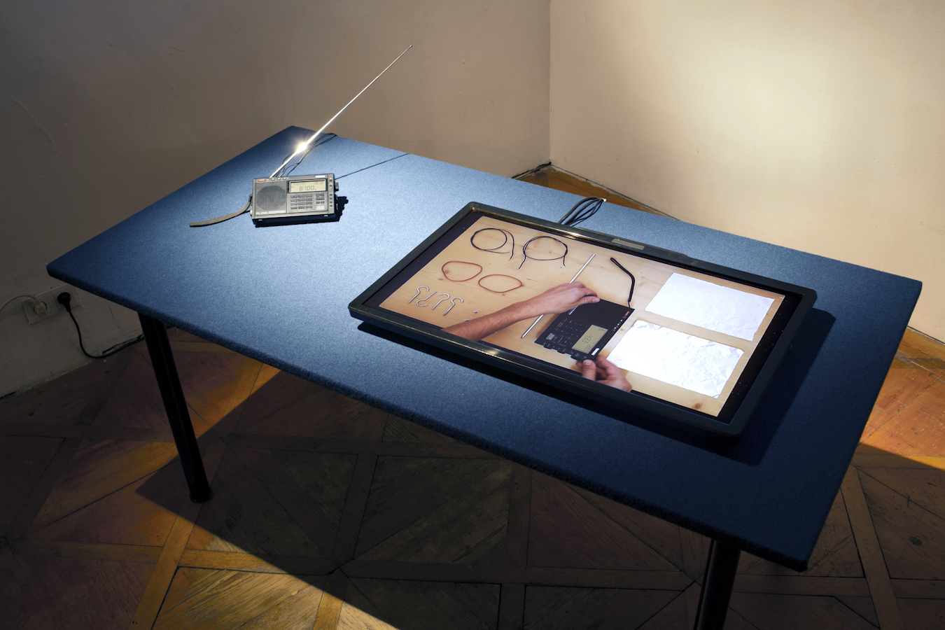 HD video 60-minute loop, single-channel audio 60-minute loop, table, blue cloth, screen, shortwave radio