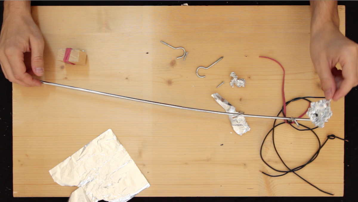 string, wood, foil, e-bow, video, mirror, coloured light