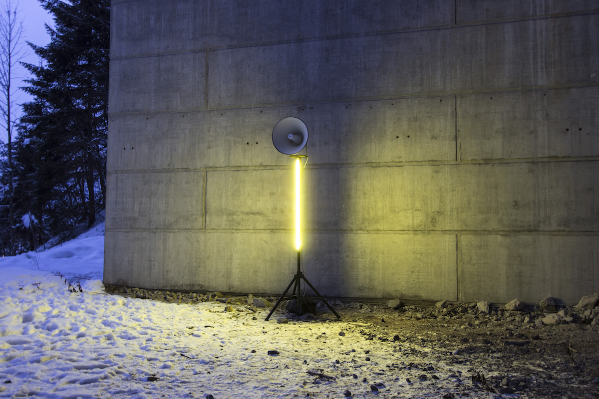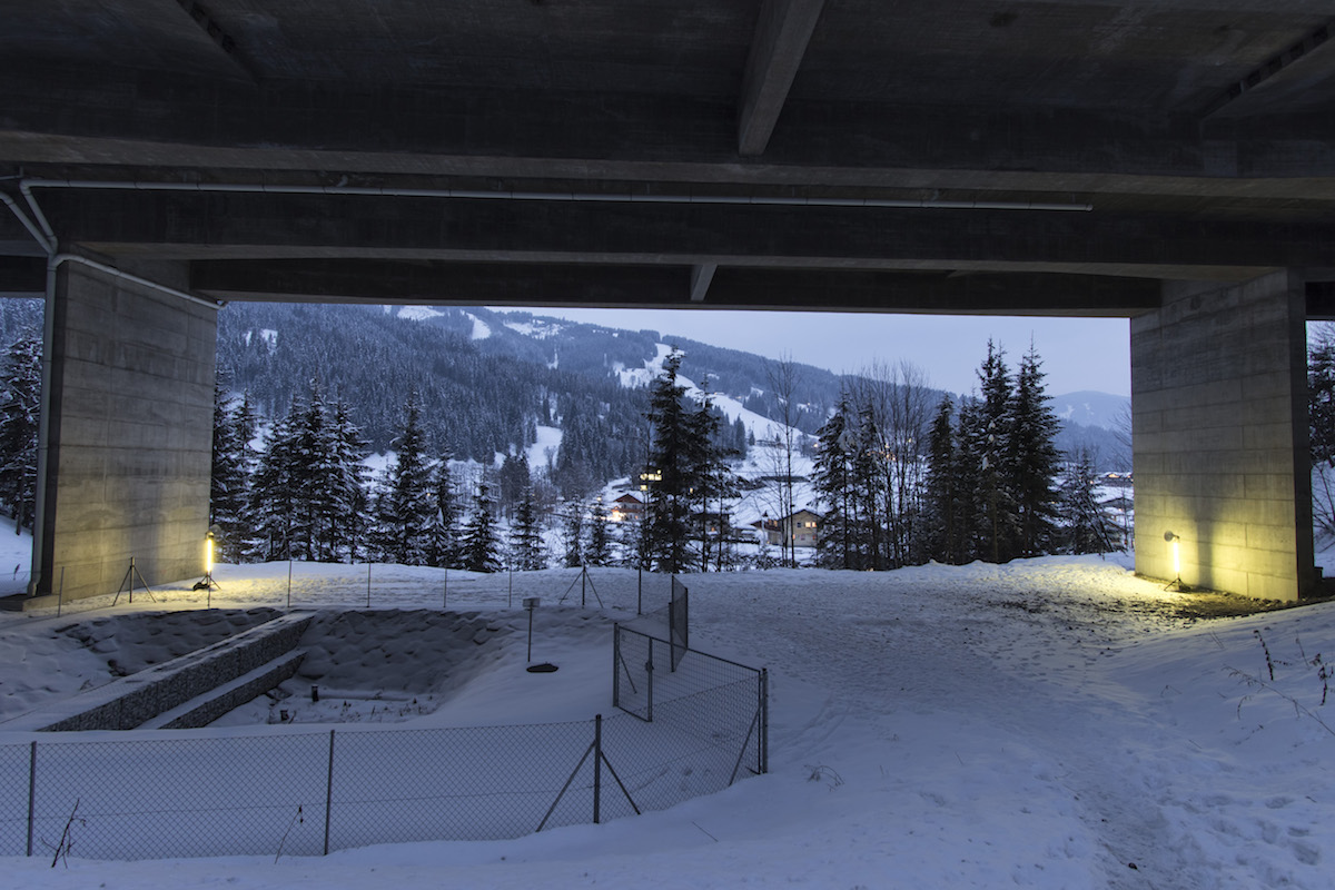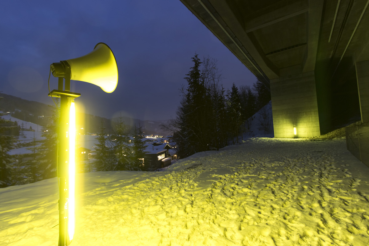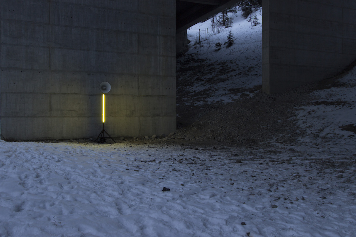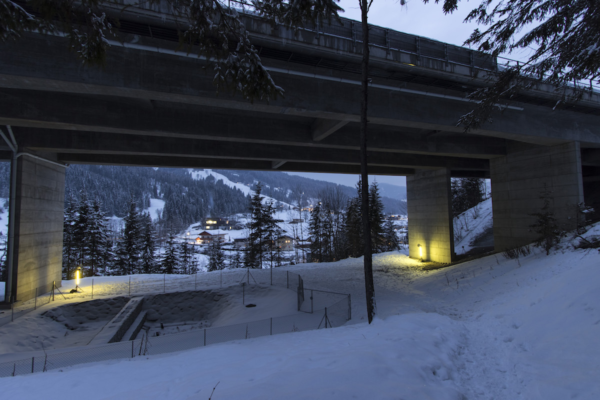 Installed under a motorway bridge, the mood clearly contrasts with the party atmosphere of après-ski events. In such a divergent situation, the animated calls from the DJ take on an absurd quality. Who is this man cheering for? Himself, the employees of the ski resort, the tourists?