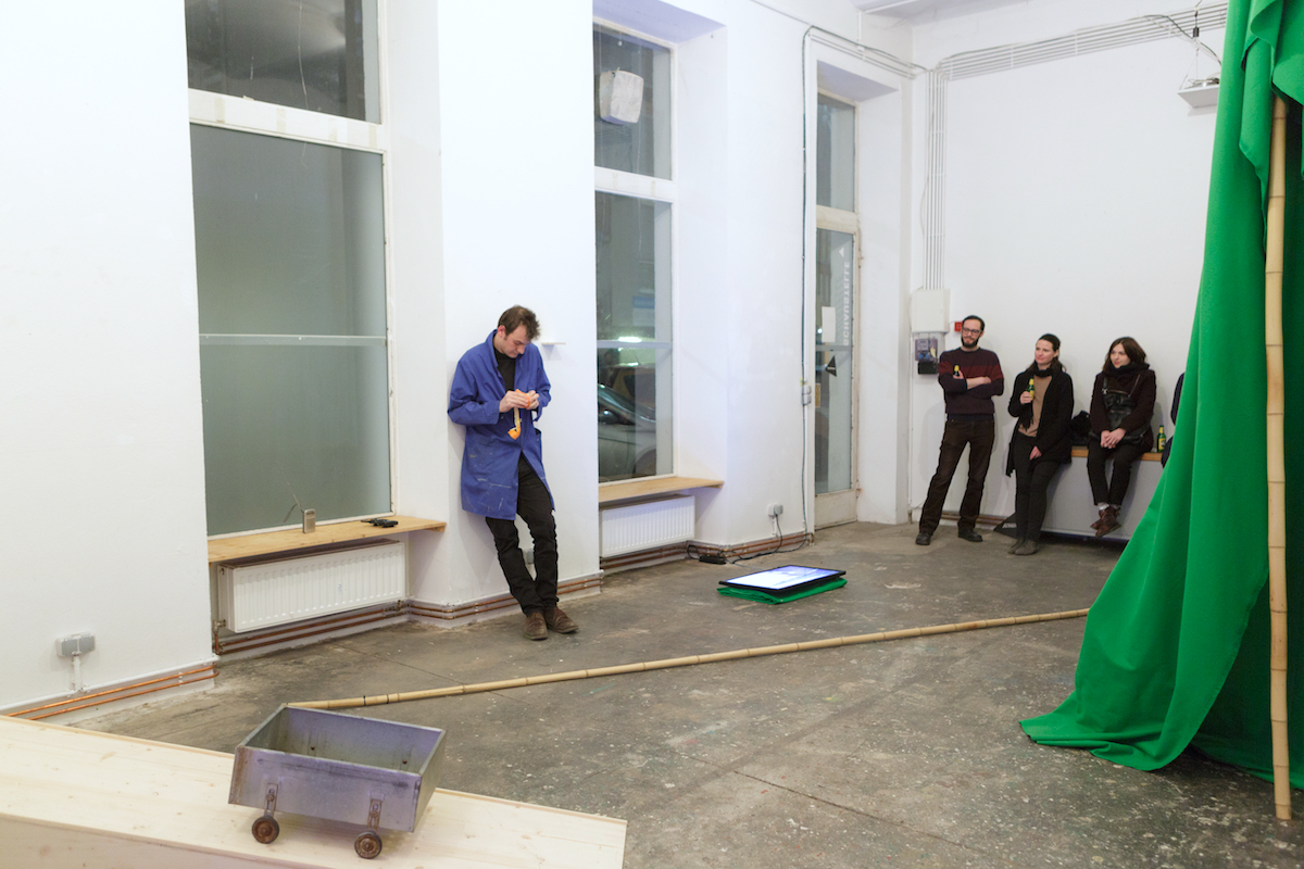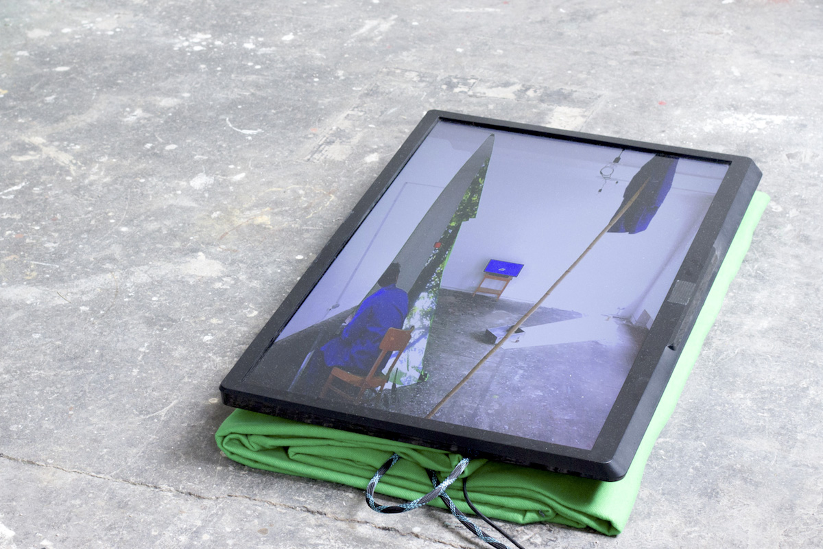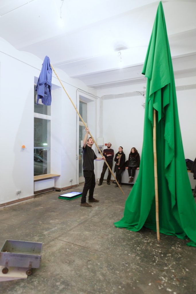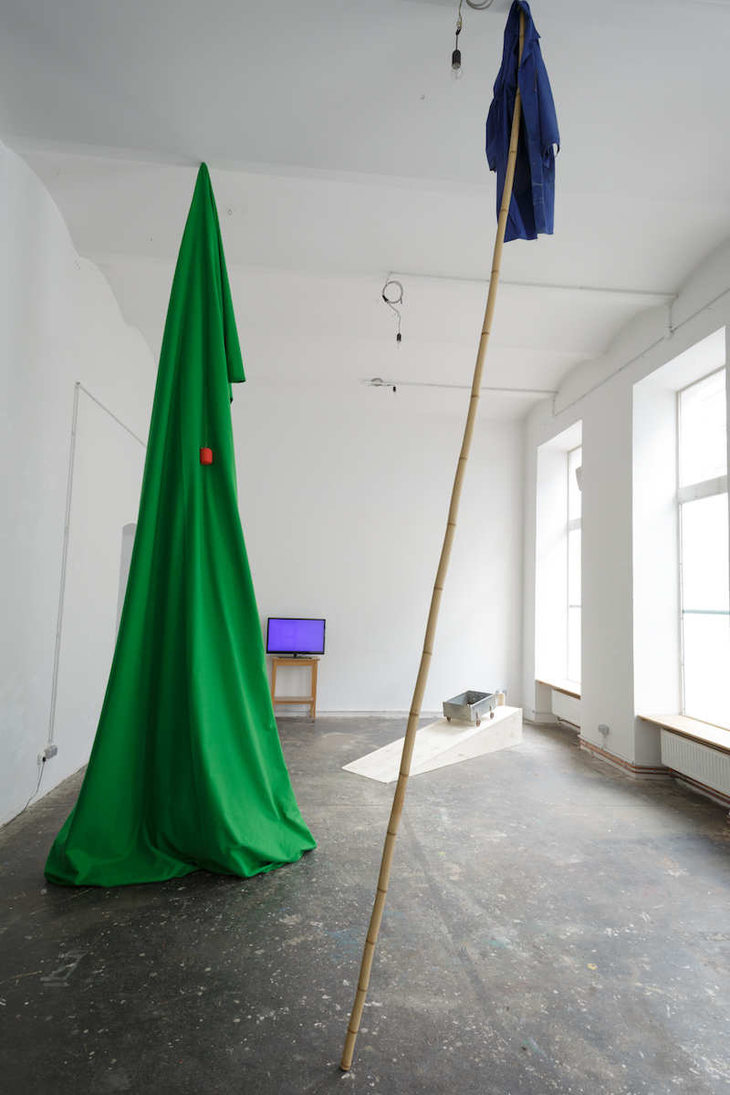 Green Screen Tree is a live green screen video installation. A large Green Screen is wedged to the ceiling with a bamboo stick, forming a fabric sculpture that stands in the room as a green column. In the monitor on the floor, you can see the live image of the entire room installation, including the work Heimliches Arbeiten beginnt. The wedged green pillar is keyed out and replaced by a video. In this video shows the artist in a blue coat working on a computer, which refers to the opening performance Break (orange).