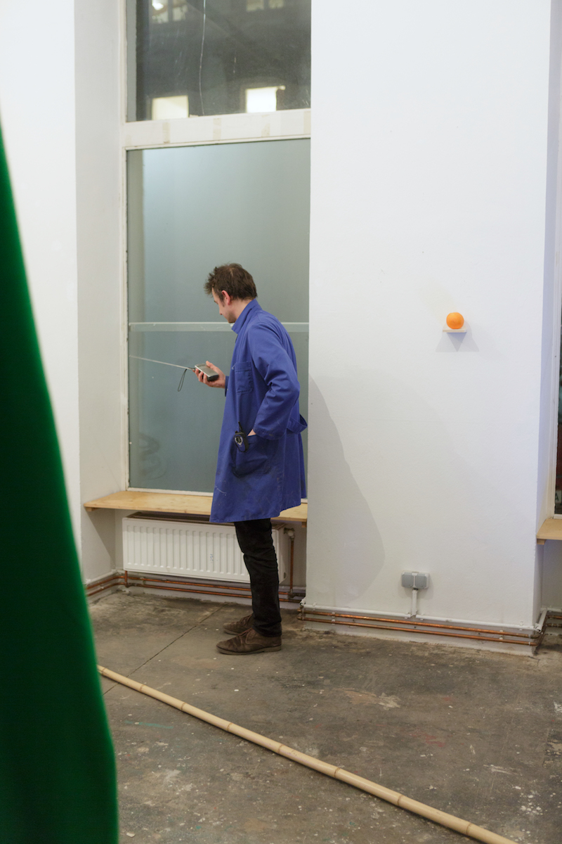 The opening-performance Break (Orange) was part of a the solo show Heimliches arbeiten beginnt. in Vienna. The Show consist of three works which interlock with each other and create a strongly interconnected world. The performance is connected to the video installation Green Screen Tree, picks up elements of it and changing the setting of the whole show to completing it.