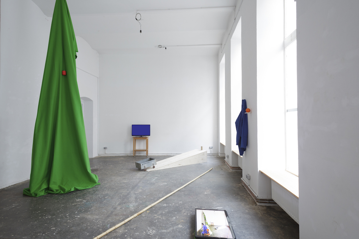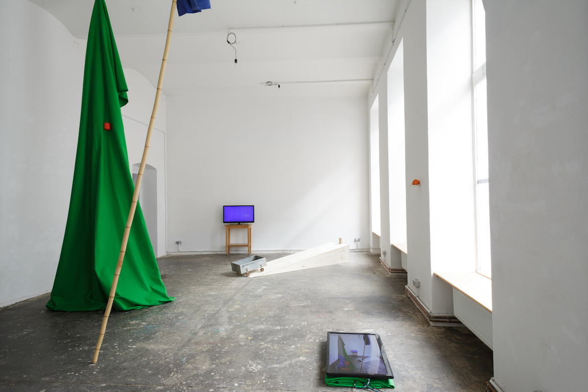 The video installation Green Screen Tree is part of the solo show Heimliches arbeiten beginnt and consists of three works that are strongly interlinked and create a strongly connected world.