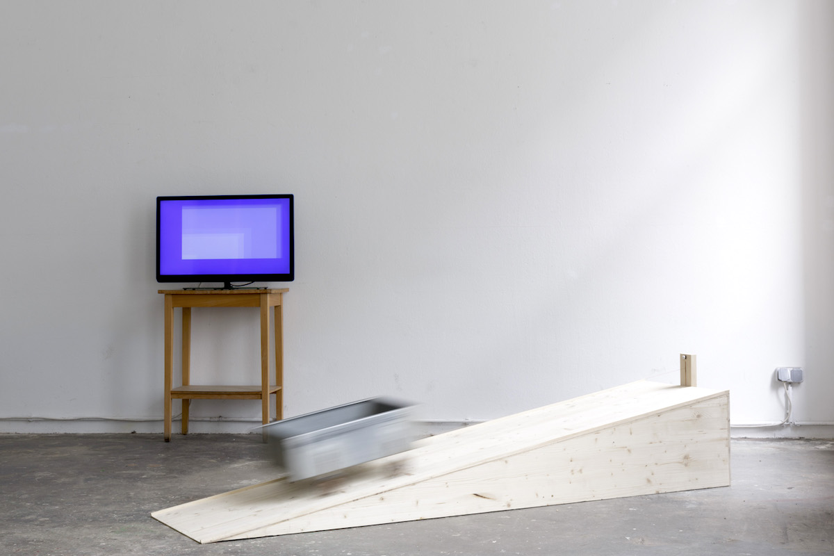 The installation Heimliches arbeiten beginnt. consists of a video and a ramp, it visualizes an absurd, automated and purpose-free work. The video shows a blue screen and a mouse cursor moving on it — all you can hear is clicking and scrolling the cursor. At the same time, a sheet metal car moves slowly up and down on the ramp, creating a loud squeal of wheels that mingles with the seemingly disoriented click. The title of the installation refers to the first stage of being a workaholic.