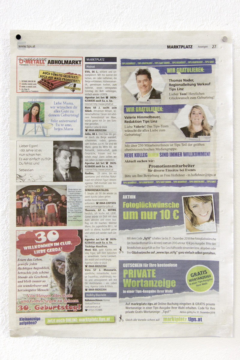 Photo congratulations are a service of the regional newspaper Tips. You can congratulate your loved ones on any anniversary with a picture and a few words. The design is then created by the editorial staff and then printed in the advertisement section of the newspaper. In addition, a collector’s album with 25 copies was printed to collect and store the congratulations.