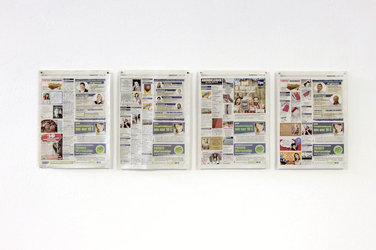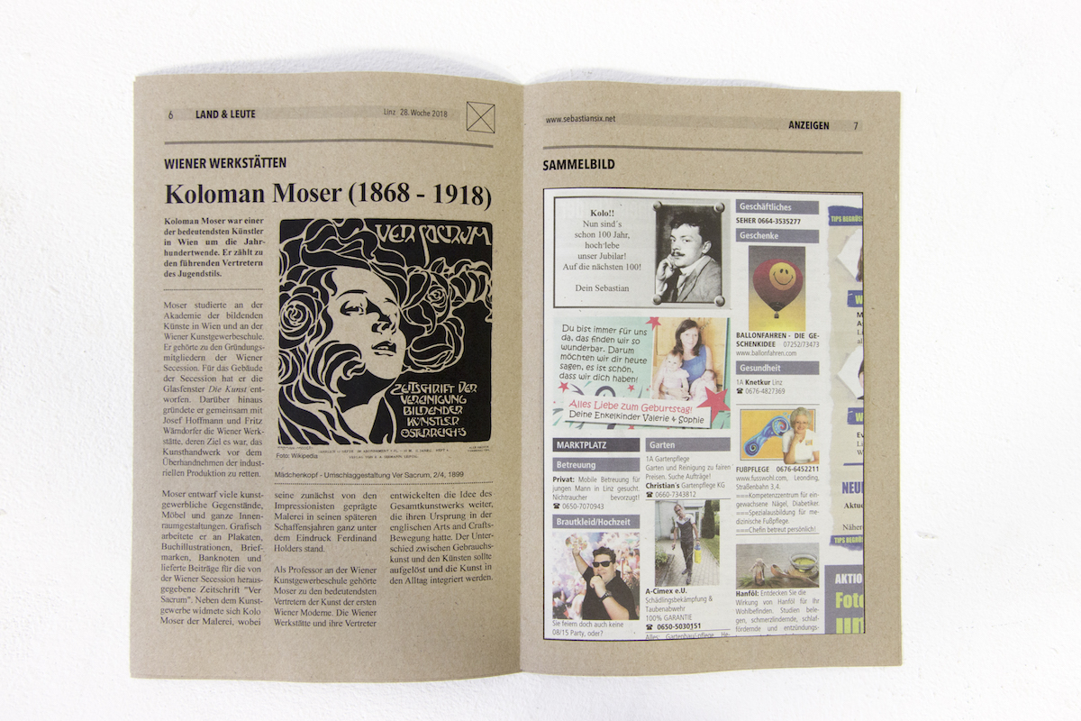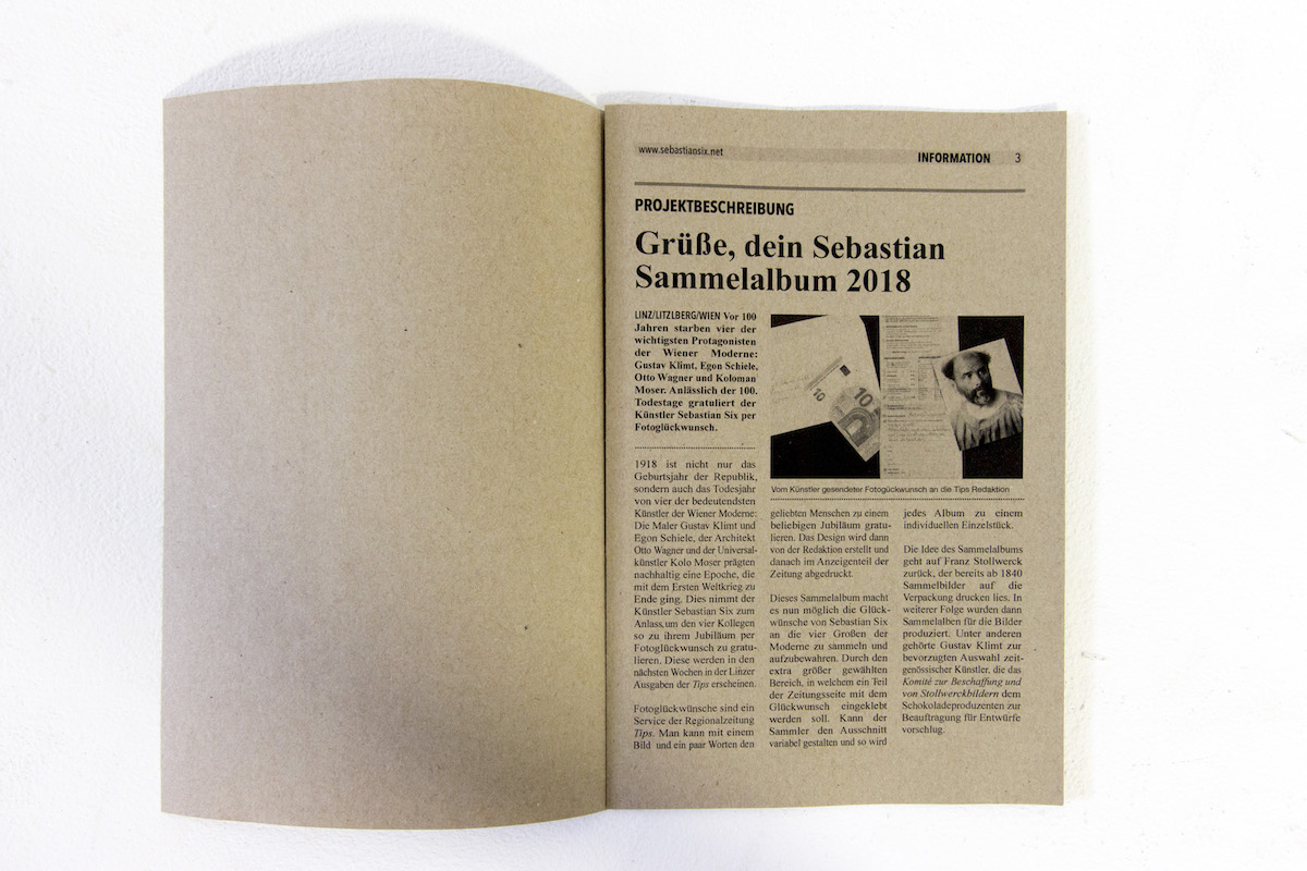 [su_accordion][su_spoiler title=“Deutsch“ open=“no“ style=“default“ icon=“plus“ anchor=““ class=““]Vor 100 Jahren (1918) starben vier der wichtigsten Protagonisten der Wiener Moderne: Gustav Klimt, Egon Schiele, Otto Wagner und Koloman Moser. Dies nahm der Künstler zum Anlass um den vier Kollegen so zu ihrem Jubiläum per Fotoglückwunsch zu gratulieren.Fotoglückwünsche sind ein Service der Regionalzeitung Tips. Man kann mit einem Bild und ein paar Worten den geliebten Menschen zu einem beliebigen Jubiläum gratulieren. Das Design wird dann von der Redaktion erstellt und danach im Anzeigenteil der Zeitung abgedruckt.Zusätzlich wurde ein Sammelalbum mit einer 25 Stück Auflage gedruckt um die Glückwünsche zu sammeln und aufzubewahren.[/su_spoiler]